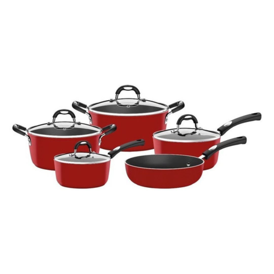 há 4 semanasO jogo de panelas Tramontina Mônaco em alumínio com revestimento interno em Starflon Premium e externo siliconado vermelho 05 peças é essencial para quem não abre mão de beleza e qualidade em sua cozinha. Desenvolvidas em alumínio com revestimento interno em antiaderente Starflon Premium, suas peças são perfeitas para uso diário, pois cozinham os alimentos de maneira rápida e uniforme e evitam que eles grudem na superfície. Para auxiliar no preparo e facilitar a visualização, as caçarolas e panelas do jogo vem com tampa de vidro temperado com saídas de vapor e bordas de aço inox. Todos os cabos, alças e pegadores são metálicos com proteção em silicone, material que não aquece e torna o manuseio muito mais seguro. Sem dúvida, um jogo que vai deixar sua cozinha muito mais prática, pois é muito fácil de limpar e pode ser levado à máquina de lavar louças!
