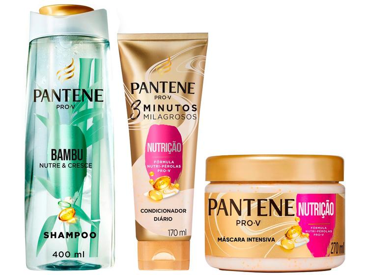 O kit tratamento para o cabelo Nutrição da Pantene contém Pérolas pro-vitaminas e é ideal para você. O kit contém Shampoo Bambu Nutre e Cresce formulado para auxiliar na quebra de cabelo, nutrindo desde as raízes, para o cabelo crescer mais forte. Um Shampoo transparente que limpa profundamente ao mesmo tempo que protege a estrutura do cabelo. Com extrato de bambu e óleo de rícino. Contém 0% de parabenos, corantes e óleos minerais. Condicionador Diário Nutrição 3 minutos milagrosos, um condicionador que te ajuda a repor nutrientes para um cabelo saudável desde a raíz até as pontas. Repara 100% do dano em 3 minutos. A Máscara capilar Pantene Nutrição irá completar o seu cronograma capilar. As Pérolas Pro-V são partículas que liberam milhões de lipídios que se dissolvem no creme, uma tecnologia exclusiva Pantene. Sinta a diferença. Composto por 3 peças (1 Shampoo de 400ml, 1 Condicionador de 170ml e 1 Máscara Capilar de 270ml).